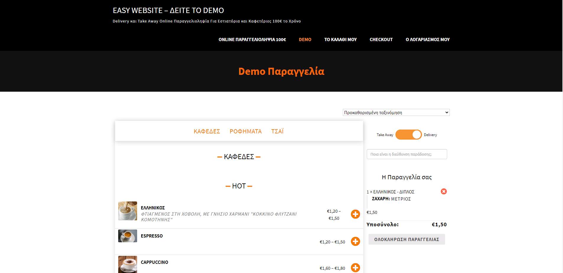 https://www.easywebsite.gr/caferestaurantdelivery/ Δείτε το Demo για Online Παραγγελιοληψία για Εστιατόριο Καφετέρια 100€+φπα το χρόνο